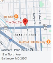 Club Car Baltimore is located at 12 W North Ave, Baltimore, MD 21201. This is at the corner of W. North Avenue and N. Charles Street in the Station North area.